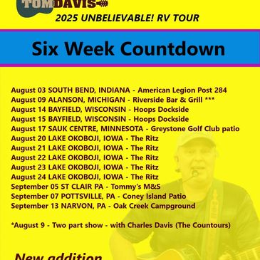 We're in Lake Metigoshe State Park in North Dakota while I perform through July 13 at the A-Frame Bar & Grill and at Sundowners Pizza. Both are located on the lake front. From here we'll travel to Lake Okoboji, Iowa for performances at The Ritz lakeside patio restaurant. (July 16 through July 20). For the whole tour schedule click the red calendar picture below right. Real time updates via the Facebook page